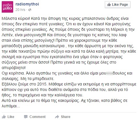 Μπορείς να εμμένεις στον λαϊκότροπο κακόβουλο λόγο σου και να αφήσεις ήσυχους όρους κοινωνικής ευαισθησίας. Αρπάζοντας τα λεκτικά λάβαρα της ομοφοβίας, μάλλον δεν καταφέρνεις να μεταλλάξεις την μισογυνία σε σοβαρή τοποθέτηση.