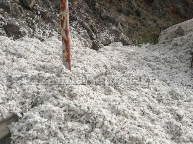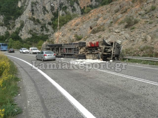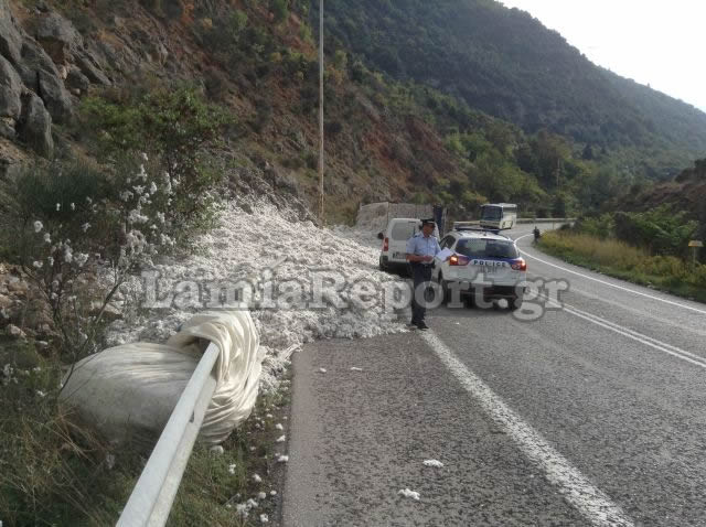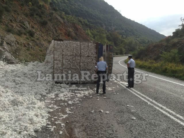 Στην μεγάλη στροφή, πριν το Σκαμνό, ο 4οχρονος οδηγός έχασε τον έλεγχο, από άγνωστη αιτία, με αποτέλεσμα η νταλίκα που ήταν φορτωμένη με βαμβάκι να ανατραπεί.