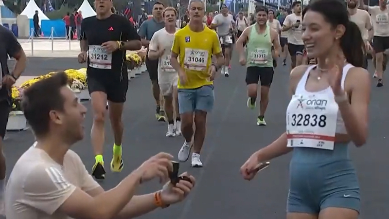 Την ώρα που εκείνη περνούσε τη γραμμή του τερματισμού, εμφανώς κουρασμένη αλλά χαρούμενη, εκείνος άνοιξε ένα μικρό κουτί και της πρόσφερε το δαχτυλίδι.