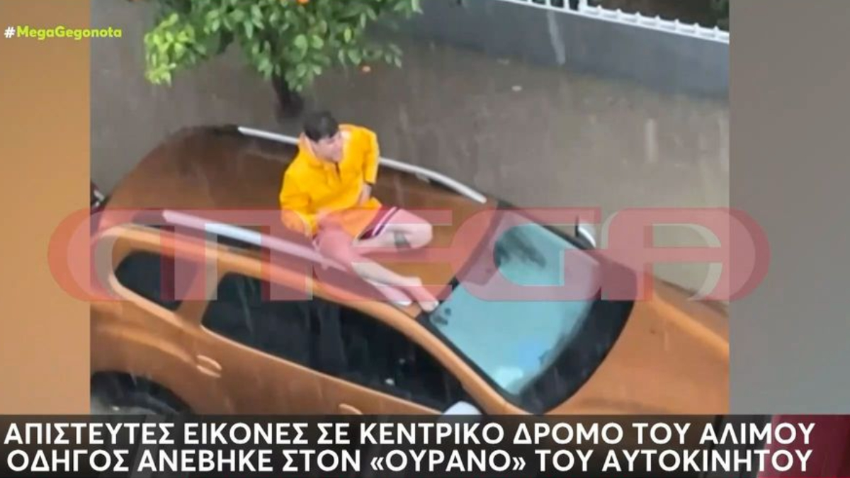 Τα έντονα καιρικά φαινόμενα συνεχίστηκαν με αμείωτη ένταση, προκαλώντας χάος και στους δρόμους. Ένα χαρακτηριστικό περιστατικό καταγράφηκε πάλι στον Άλιμο, όπου ένας οδηγός ανέβηκε στην οροφή του αυτοκινήτου του για να γλιτώσει από τα νερά. Οι εικόνες δείχνουν τον άνθρωπο φοβισμένο, την ώρα που οι δρόμοι είχαν μετατραπεί σε ποτάμια.