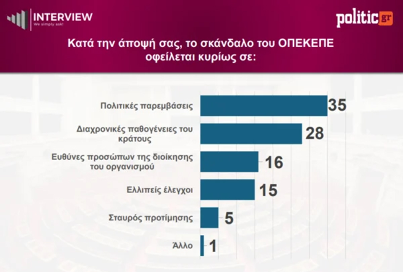 Συγκεκριμένα, το 35% θεωρεί ότι το ζήτημα σχετίζεται με πολιτικές παρεμβάσεις, ενώ το 28% το αποδίδει σε διαχρονικές αδυναμίες του κράτους.
