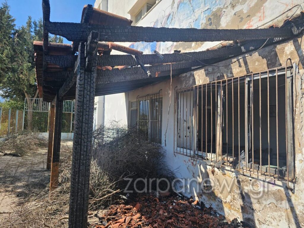 Σύμφωνα με φωτογραφίες που δημοσίευσε το zarpanews.gr, η φωτιά κατέστρεψε την πέργκολα και τμήμα της αυλής, ενώ έσπασαν και δύο τζάμια σε αίθουσα διδασκαλίας. Επιπλέον, καταγράφηκαν μικρότερες ζημιές στο εσωτερικό της αίθουσας.
