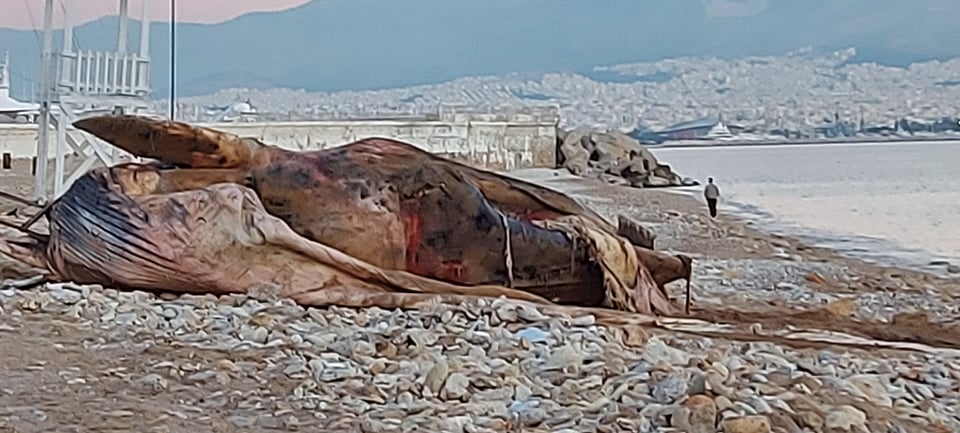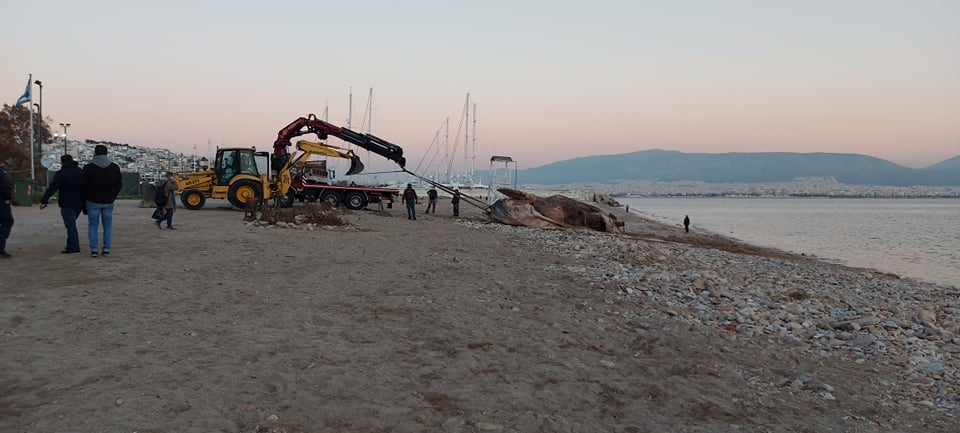 Το θηριώδες θηλαστικό ξεβράστηκε στην ακτή, με συνεργεία του δήμου να έχουν φτάσει στο σημείο και να προσπαθούν να την μεταφέρουν από το σημείο.