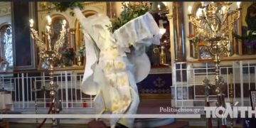 “Ρε παιδιά τι κάνετε; Αυτό λέγεται ανάσταση; Αίσχος! Αίσχος στην Πολιτεία! Αίσχος στην Αστυνομία που χρησιμοποιεί βία. Αίσχος!” φώναζε ο ιερέας στο προαύλιο κρατώντας δάφνες στο χέρι.