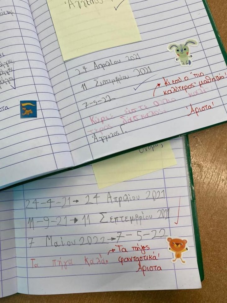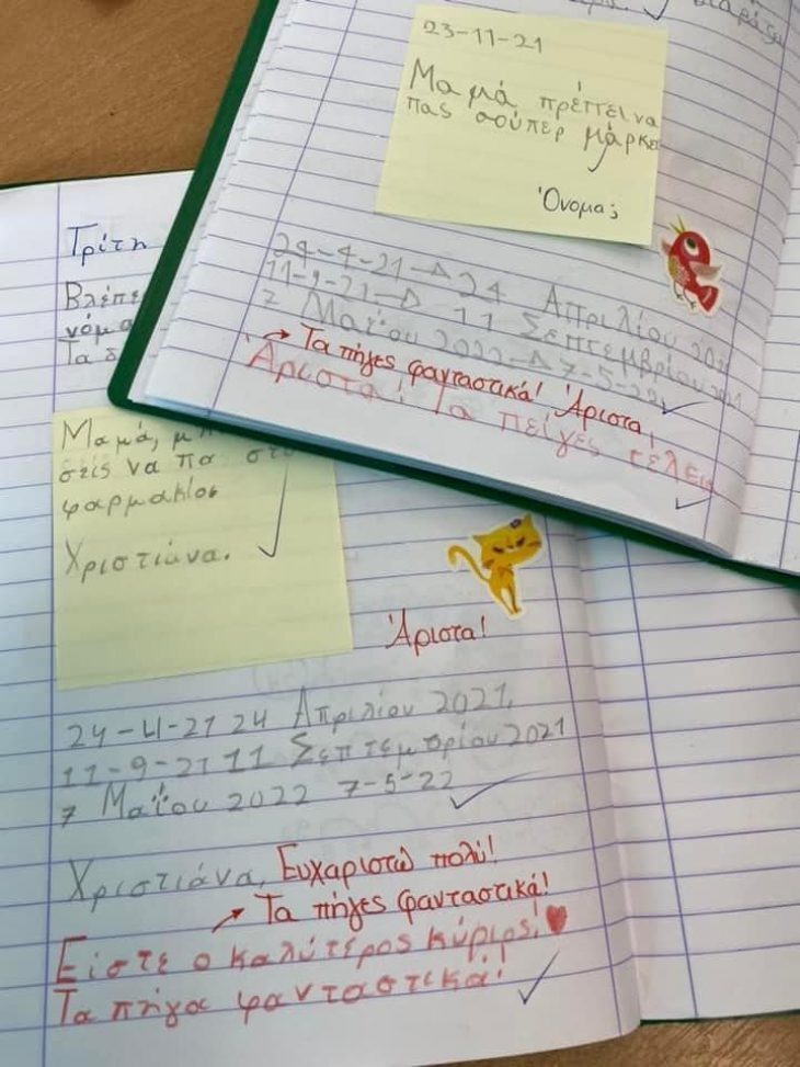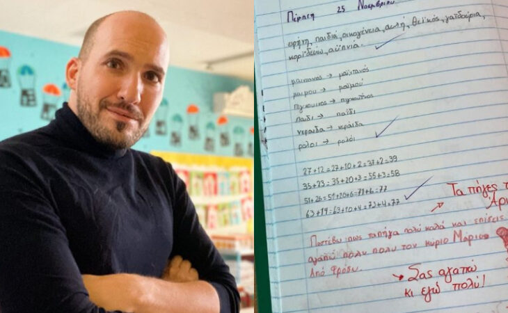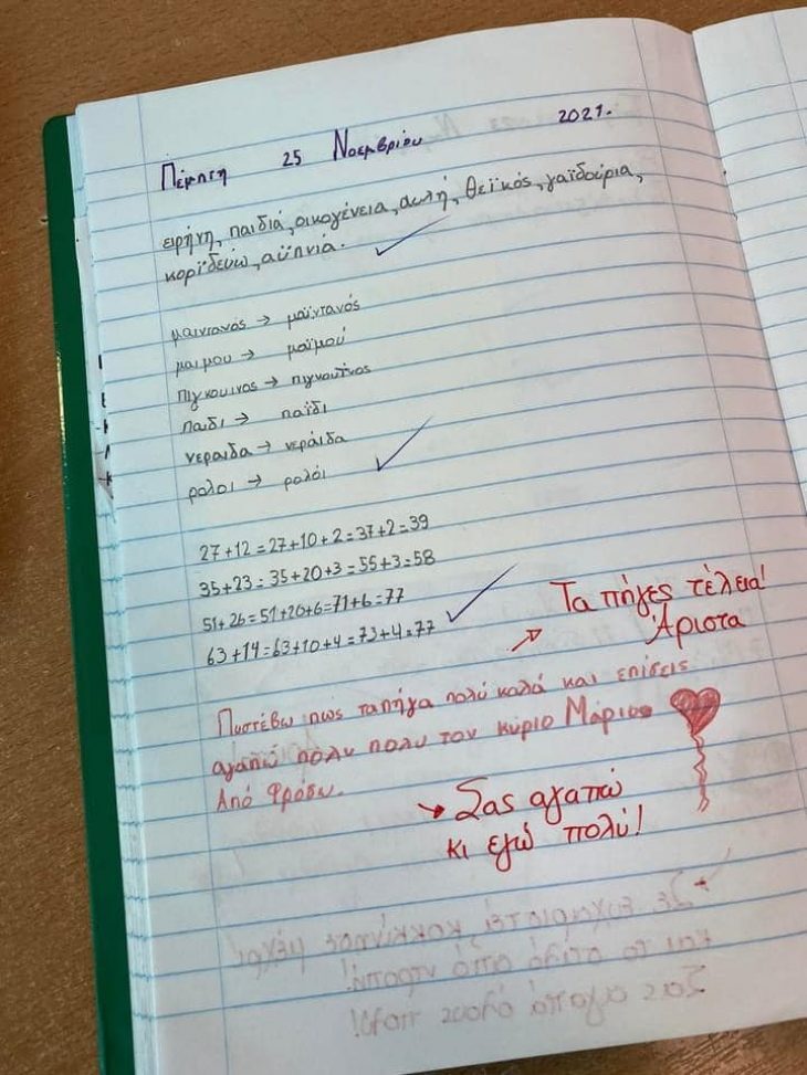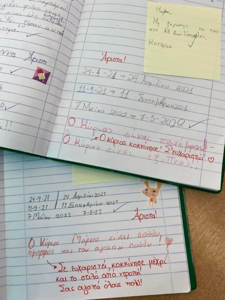Η τρυφερότητα και ο σεβασμός που δείχνει ο δάσκαλος Μάριος Μάζαρης προς τους μαθητές του, αντικατοπτρίζονται στα σχόλια που γράφει στα τετράδιά τους. Λόγια ενθάρρυνσης, γεμάτα φροντίδα και αγάπη για το σχολείο και τη μάθηση, μετατρέπουν ένα απλό γραπτό σε ευκαιρία για ενίσχυση της αυτοπεποίθησης των παιδιών.