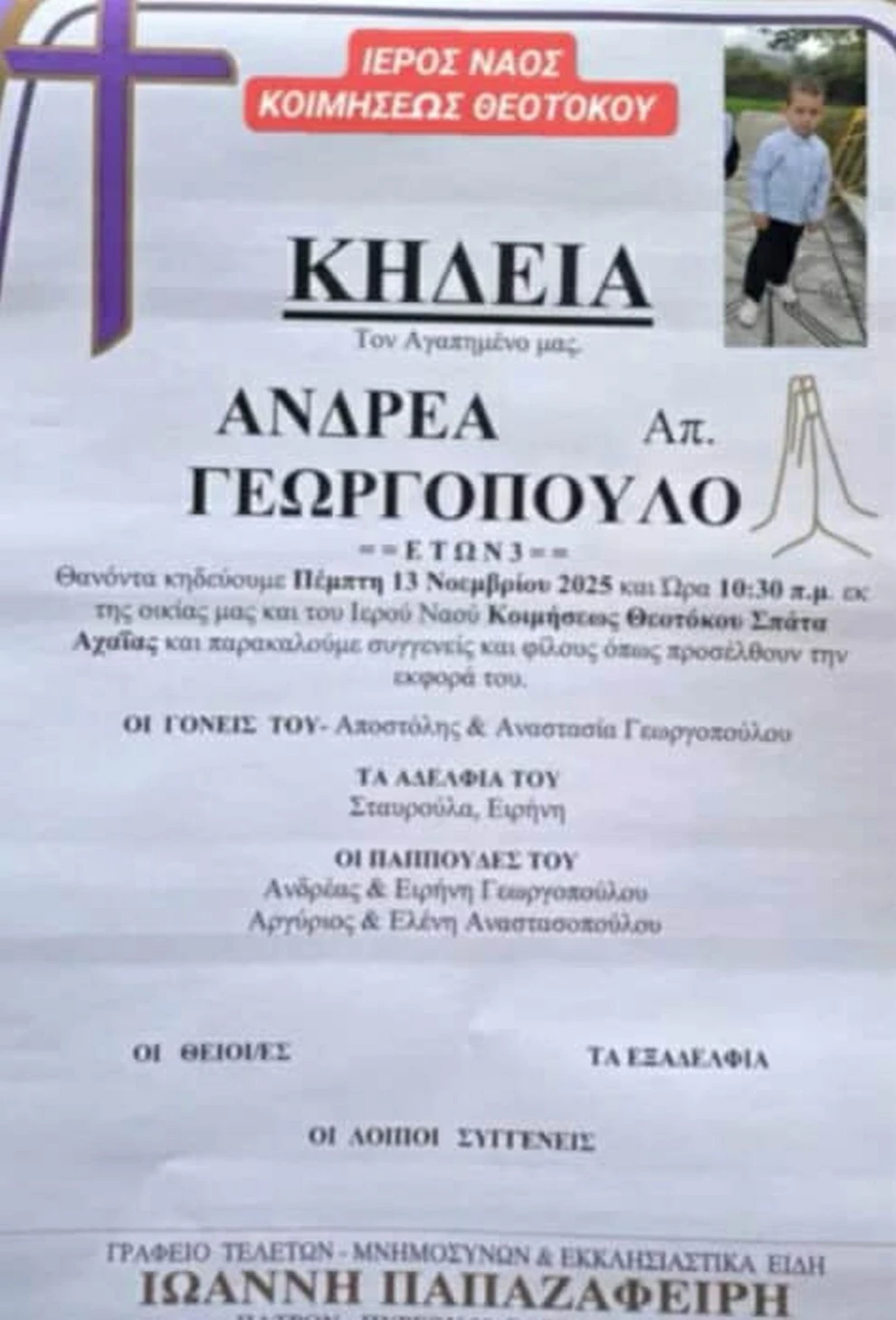 Ο τρίχρονος Ανδρέας άφησε την τελευταία του πνοή στο Καραμανδάνειο Νοσοκομείο Παίδων στην Πάτρα, ύστερα από σοβαρό τραυματισμό, με τις Αρχές να εξετάζουν δύο διαφορετικά σενάρια για τις συνθήκες του δυστυχήματος.