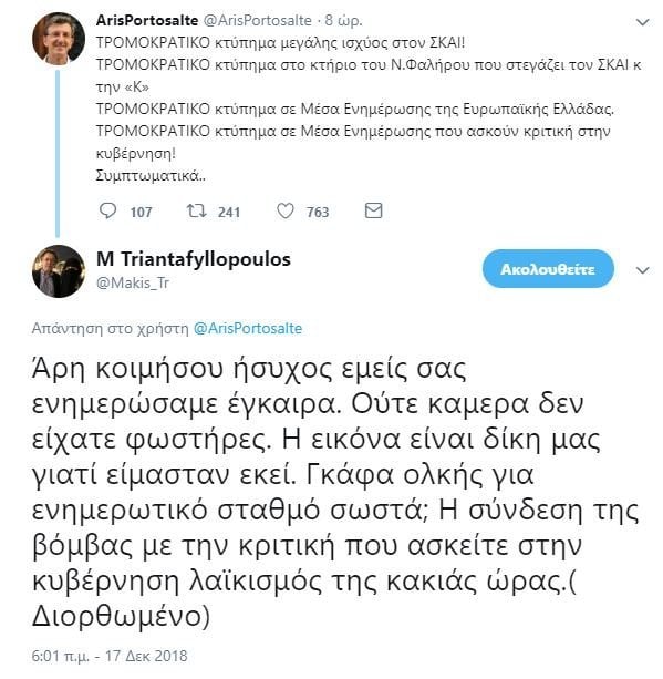 Λίγη ώρα μετά ο ιδιοκτήτης της zougla.gr ο Μάκης Τριανταφυλλόπουλος έγραψε: «Άρη κοιμήσου ήσυχος εμείς σας ενημερώσαμε έγκαιρα. Ούτε κάμερα δεν είχατε φωστήρες. Η εικόνα είναι δίκη μας γιατί είμασταν εκεί. Γκάφα ολκής για ενημερωτικό σταθμό σωστά; Η σύνδεση της βόμβας με την κριτική που ασκείτε στην κυβέρνηση λαϊκισμός της κακιάς ώρας».