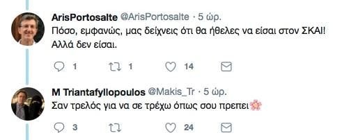 «Πόσο, εμφανώς, μας δείχνεις ότι θα ήθελες να είσαι στον ΣΚΑΙ! Αλλά δεν είσαι», ανταπάντησε ο Άρης Πορτοσάλτε για να λάβει την απόκριση Τριανταφυλλόπουλου: «Σαν τρελός για να σε τρέχω όπως σου πρέπει».