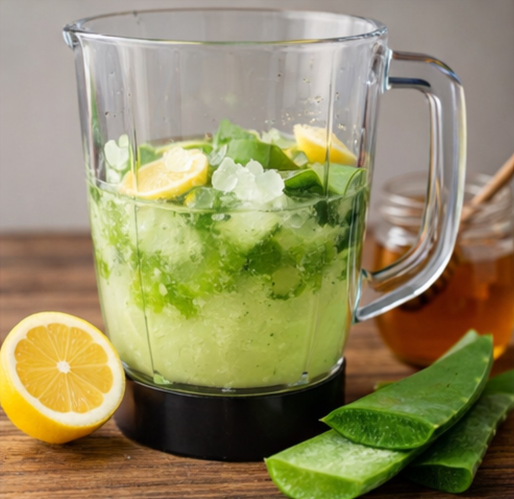 3. Βάλτε το ζελέ αλόης στο μπλέντερ μαζί με τον χυμό λεμονιού και δύο ποτήρια νερό.