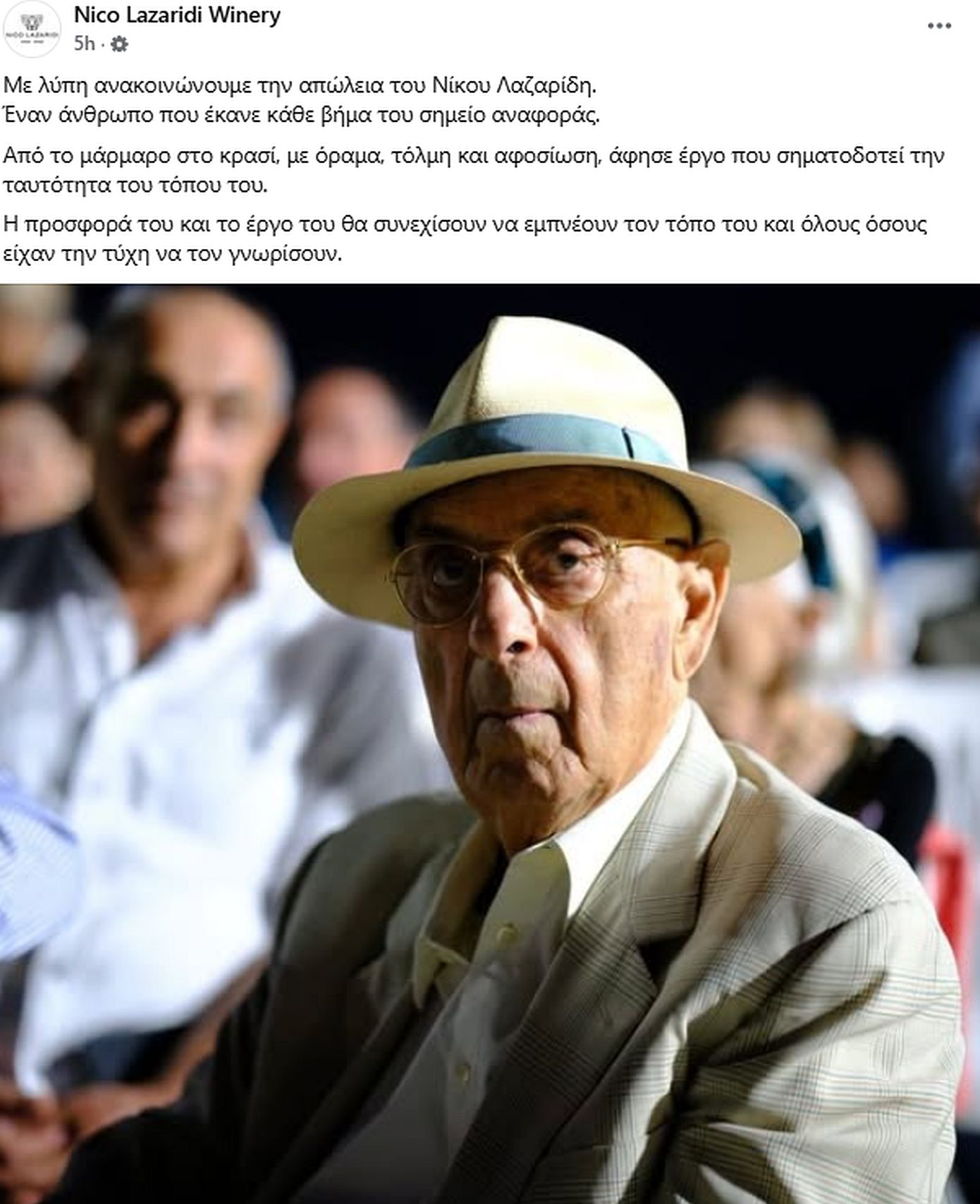 «Με λύπη ανακοινώνουμε την απώλεια του Νίκου Λαζαρίδη. Έναν άνθρωπο που έκανε κάθε βήμα του σημείο αναφοράς. Από το μάρμαρο στο κρασί, με όραμα, τόλμη και αφοσίωση, άφησε έργο που σηματοδοτεί την ταυτότητα του τόπου του. Η προσφορά του και το έργο του θα συνεχίσουν να εμπνέουν τον τόπο του και όλους όσους είχαν την τύχη να τον γνωρίσουν».