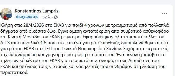 Το παιδί μεταφέρθηκε στο Νοσοκομείο Χανίων, όπως περιέγραψε σε ανάρτησή του στο Facebook ο γιατρός του ΕΚΑΒ Χανίων, Κωνσταντίνος Λαμπρής.
