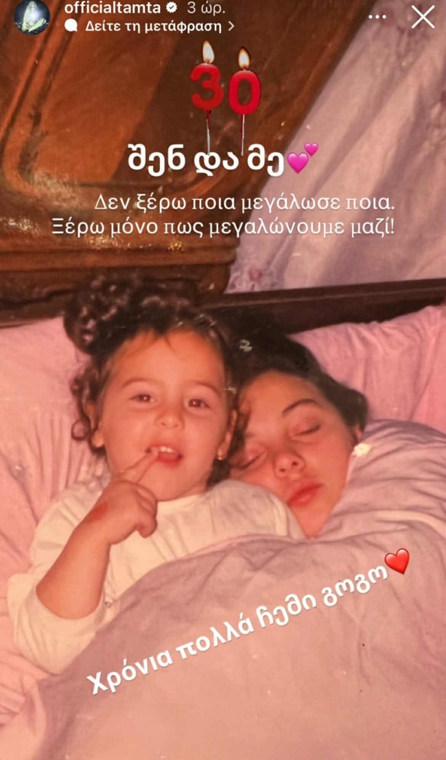 Η Άννα, η κόρη της Τάμτα, γιόρτασε πρόσφατα τα 30ά της γενέθλια. Με αφορμή τη σημαντική αυτή μέρα, η γνωστή τραγουδίστρια ανάρτησε μια παλιά φωτογραφία από τη Γεωργία, όπου εικονίζεται ως έφηβη να κοιμάται αγκαλιά με το μωρό της. Η εικόνα αποτυπώνει τη δύναμη και την τρυφερότητα εκείνων των χρόνων.