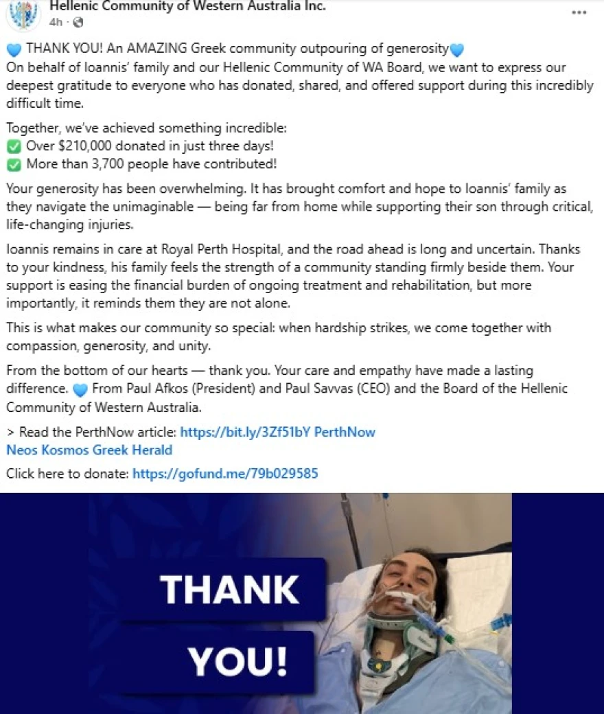Η Ελληνική Κοινότητα Δυτικής Αυστραλίας κινητοποιήθηκε άμεσα, δημιουργώντας σελίδα στο GoFundMe για τη συγκέντρωση χρημάτων με στόχο να στηρίξει οικονομικά τον Ιωάννη και την οικογένειά του.