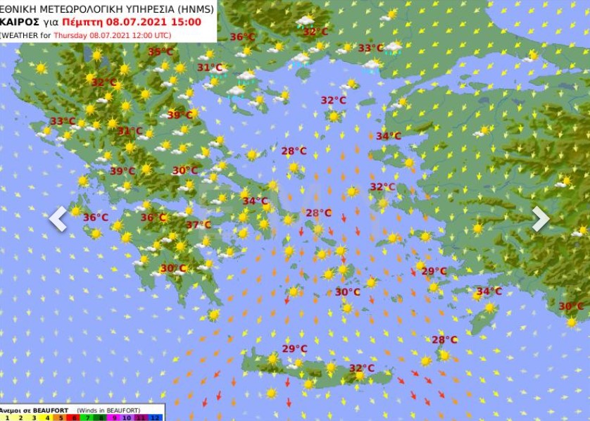 Θερμοκρασία: Από 20 έως 39 βαθμούς Κελσίου. Στα νησιά και τα παραθαλάσσια μέχρι 37 βαθμούς Κελσίου.