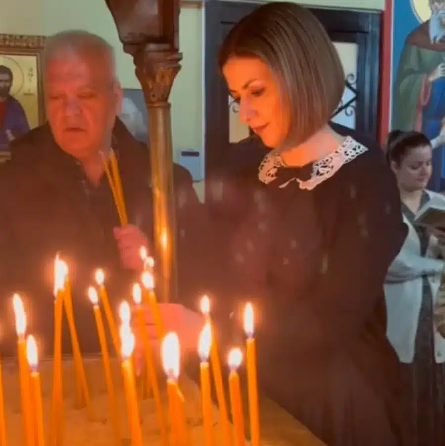 Η κυρία Αγαπηδάκη παρακολούθησε τη λειτουργία στον ιερό ναό Αγίας Μαρίνας στην Ανθούπολη Περιστερίου, παραμένοντας για περίπου τρεις ώρες μέχρι το πέρας της ακολουθίας.