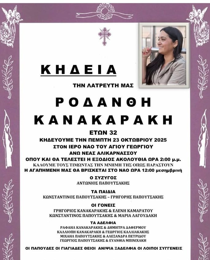 Η Ροδάνθη Κανακαράκη, μια νέα μητέρα μόλις 32 ετών, έφυγε πρόωρα από τη ζωή, σκορπίζοντας θλίψη στη Νέα Αλικαρνασσό και σε ολόκληρη την τοπική κοινωνία του Ηρακλείου.