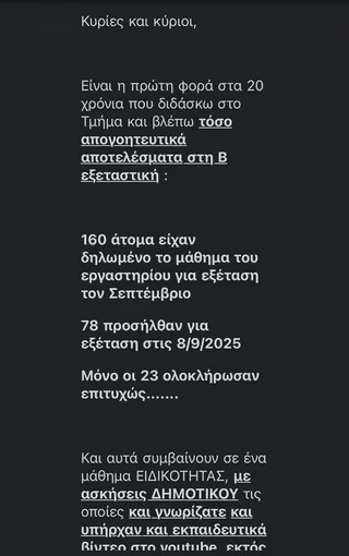 Είναι η πρώτη φορά στα 20 χρόνια που διδάσκω στο Τμήμα και βλέπω τόσο απογοητευτικά αποτελέσματα στη Β’ εξεταστική:
