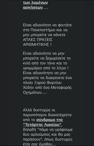 Αλλά δυστυχώς οι περισσότεροι διακατέχεστε από το σύνδρομο της “Τετάρτης Λυκείου”, δηλαδή “πάμε να γράψουμε δυο αρλούμπες και θα μας περάσουν”, όπως δυστυχώς έτσι σας έμαθαν…».
