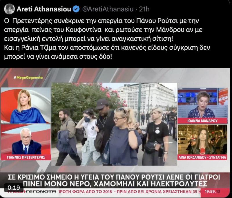Αφορμή για τη θύελλα σχολίων στάθηκε η αναφορά του Γιάννη Πρετεντέρη στον απεργό πείνας Πάνο Ρούτσι, τον τραγικό πατέρα που έχασε το παιδί του στα Τέμπη. Ο δημοσιογράφος συνέκρινε την απεργία πείνας του με εκείνη του Δημήτρη Κουφοντίνα, θέτοντας μάλιστα θέμα πιθανής αναγκαστικής σίτισης με εισαγγελική εντολή.