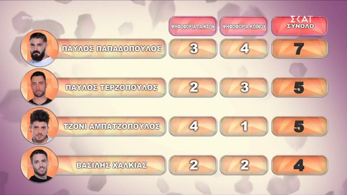 Στην ψηφοφορία των παικτών για τις γυναίκες, υπήρξε τετραπλή ισοβαθμία με τρεις ψήφους. Άρα, το κοινό θα ήταν αυτό που θα αποφάσιζε για τη μεγάλη νικήτρια. Αντίθετα, στην ψηφοφορία του σπιτιού για τους άντρες, ο Τζόνι Αμπατζόπουλος πήρε 5 ψήφους, 3 ο Παύλος Παπαδόπουλος και από 2 ο Παύλος Τερζόπουλος και ο Βασίλης Χαλκιάς.