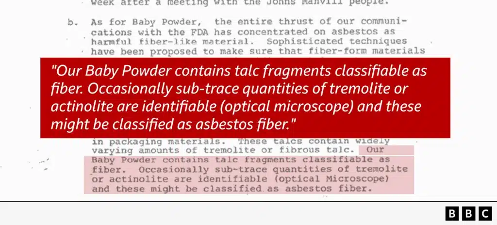 Ένα εσωτερικό έγγραφο από το 1973 φέρεται να αναφέρει: «Η βρεφική πούδρα μας περιέχει θραύσματα τάλκης που μπορούν να ταξινομηθούν ως ίνες. Περιστασιακά, μπορούν να εντοπιστούν και μικρότερες ποσότητες τρεμολίτη ή ακτινολίτη…»