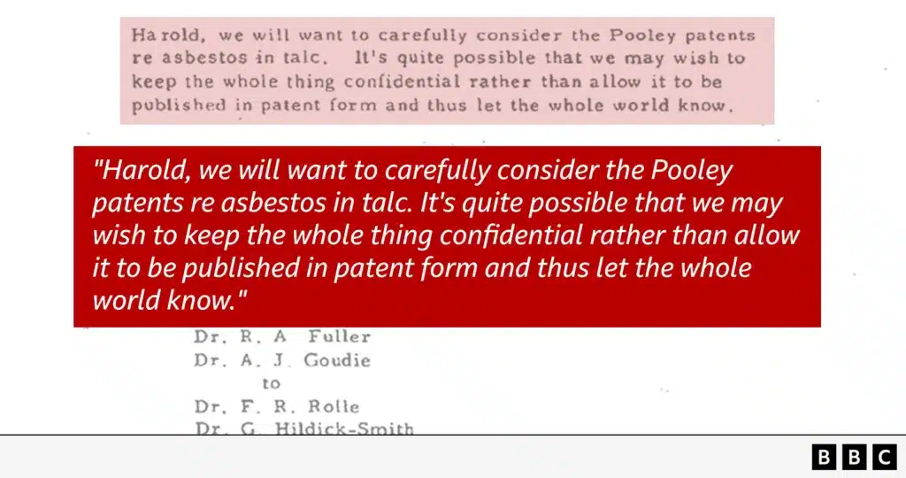 Το 2008, ένα εσωτερικό email της εταιρείας, που είδε το BBC, αναγνώριζε το πρόβλημα: «Η πραγματικότητα ότι το τάλκης δεν είναι ασφαλές για χρήση σε/γύρω από μωρά είναι ανησυχητική…» και συνέχιζε: «Δεν νομίζω ότι μπορούμε να συνεχίσουμε να το αποκαλούμε πούδρα μωρού και να το κρατάμε στον διάδρομο των μωρών».