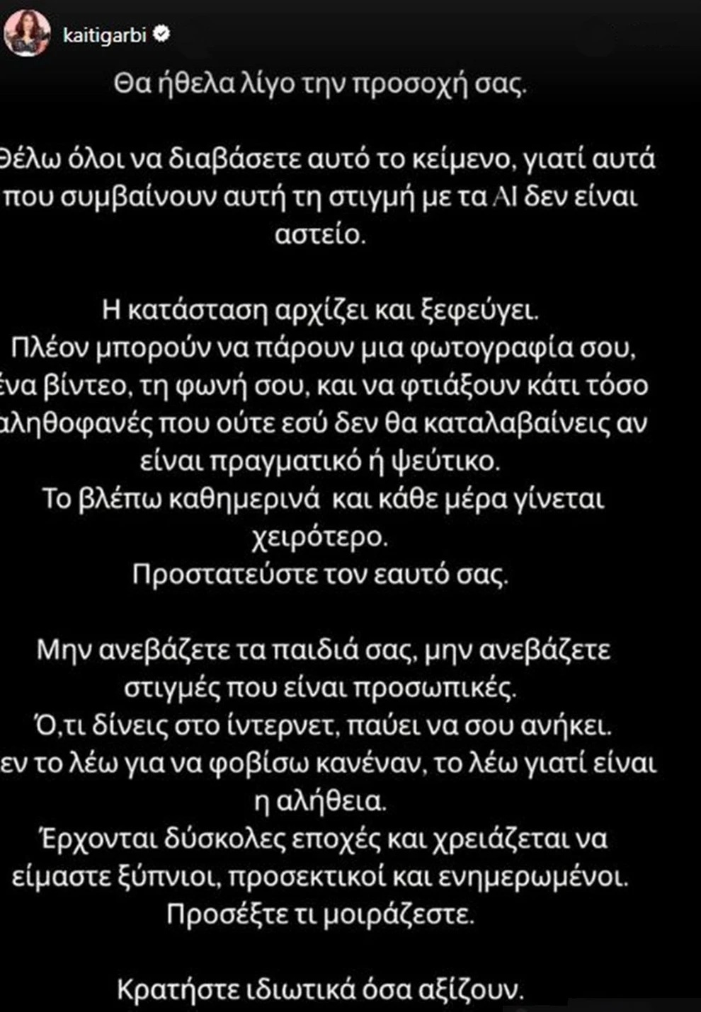 «Το βλέπω καθημερινά και κάθε μέρα γίνεται χειρότερο. Προστατεύστε τον εαυτό σας. Μην ανεβάζετε τα παιδιά σας, μην ανεβάζετε στιγμές που είναι προσωπικές. Ό,τι δίνεις στο ίντερνετ παύει να σου ανήκει. Δεν το λέω για να φοβίσω κανέναν, το λέω γιατί έτσι είναι αλήθεια. Έρχονται δύσκολες εποχές και χρειάζεται να είμαστε ξύπνιοι, προσεκτικοί και ενημερωμένοι. Προσέξτε τι μοιράζεστε. Κρατήστε ιδιωτικά όσα αξίζουν», έγραψε.