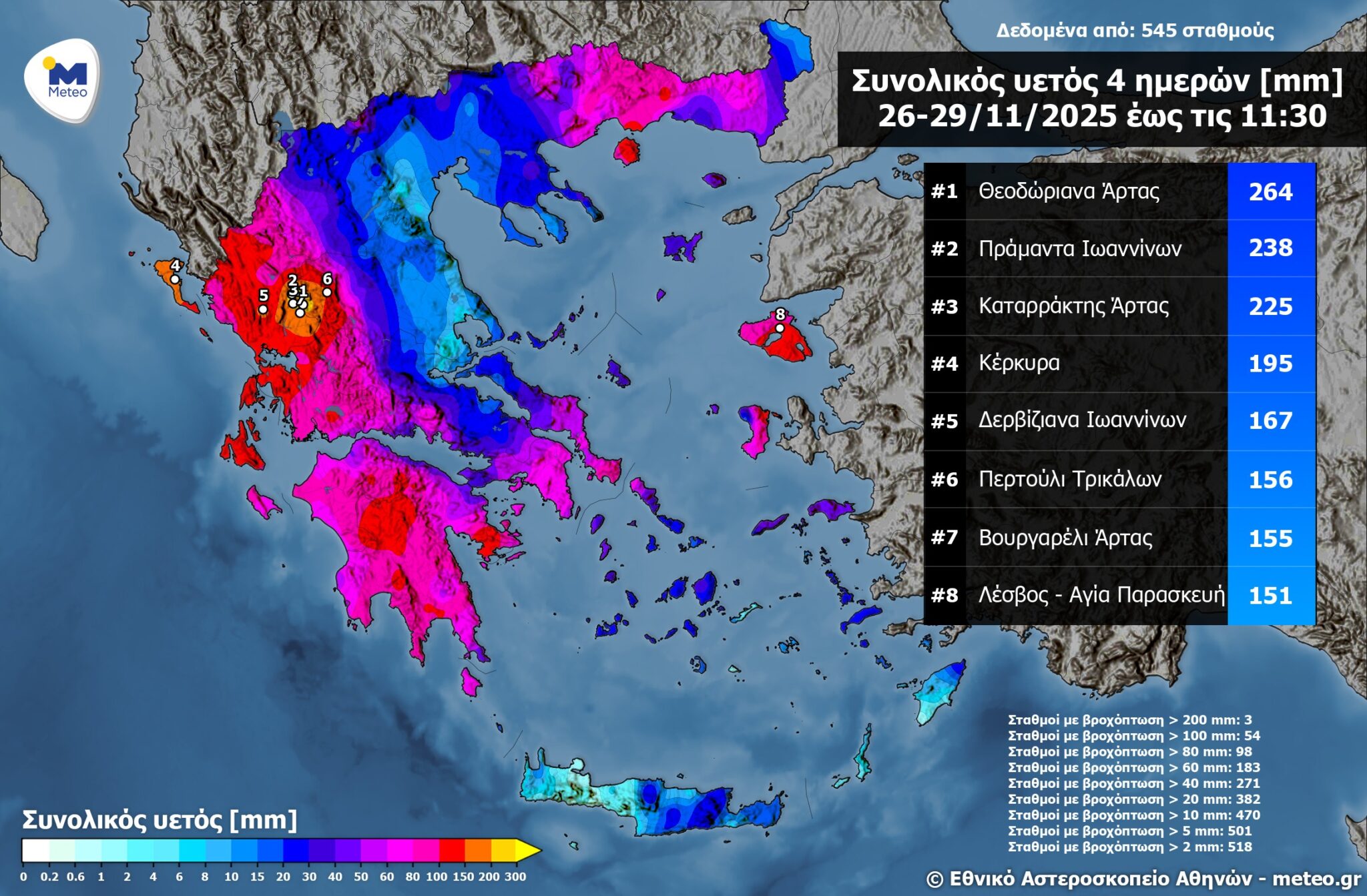 Ιδιαίτερα στην Ήπειρο και στα Τζουμέρκα, τρεις σταθμοί μέτρησαν περισσότερα από 200 χιλιοστά βροχής, ενώ σε πολλές περιοχές ο συνολικός υετός για τον Νοέμβριο ξεπέρασε τα 900 με 1.000 χιλιοστά. Το γεγονός αυτό επιδεινώνει την ήδη δύσκολη κατάσταση στις ορεινές περιοχές.