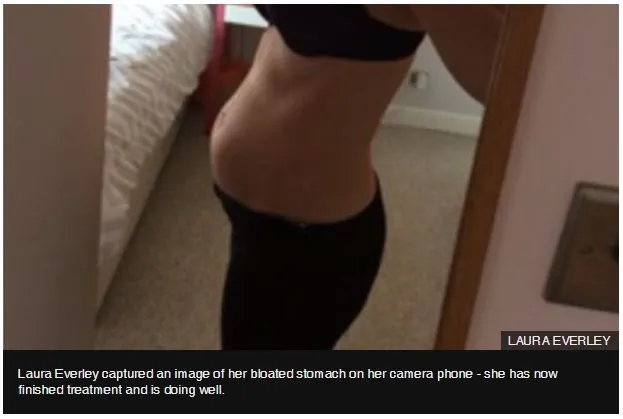 Η 38χρονη Λόρα Έβερλι από το Κρόλεϊ του Δυτικού Σάσσεξ διαγνώστηκε με καρκίνο των ωοθηκών το 2014. Πριν λάβει την επίσημη διάγνωση για τη νόσο εκδήλωνε πολλά από τα τυπικά συμπτώματα του καρκίνου των ωοθηκών, όπως το έντονο πρήξιμο στην κοιλιά.