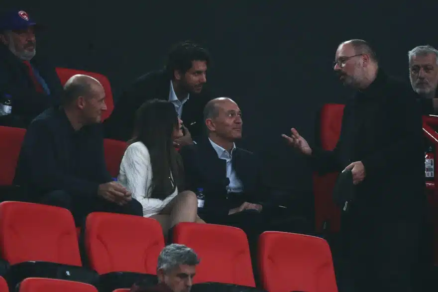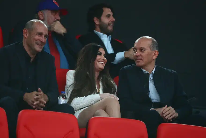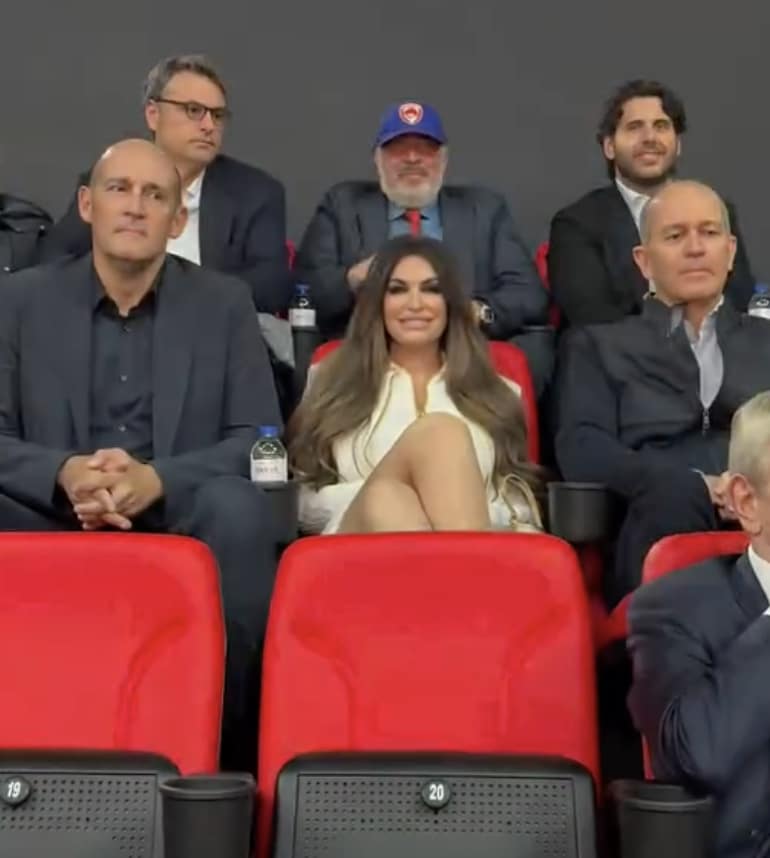 Πίσω τους βρίσκονταν ο εφοπλιστής Νίκος Τσάκος (στα αριστερά) και ο Κρις Μαραφάτσος (στα δεξιά), στενός φίλος και συνεργάτης της πρέσβειρας. Η ίδια είχε επίσης σύντομη συνομιλία με τον σκηνοθέτη Γιώργο Λάνθιμο, γνωστό υποστηρικτή του Ολυμπιακού.