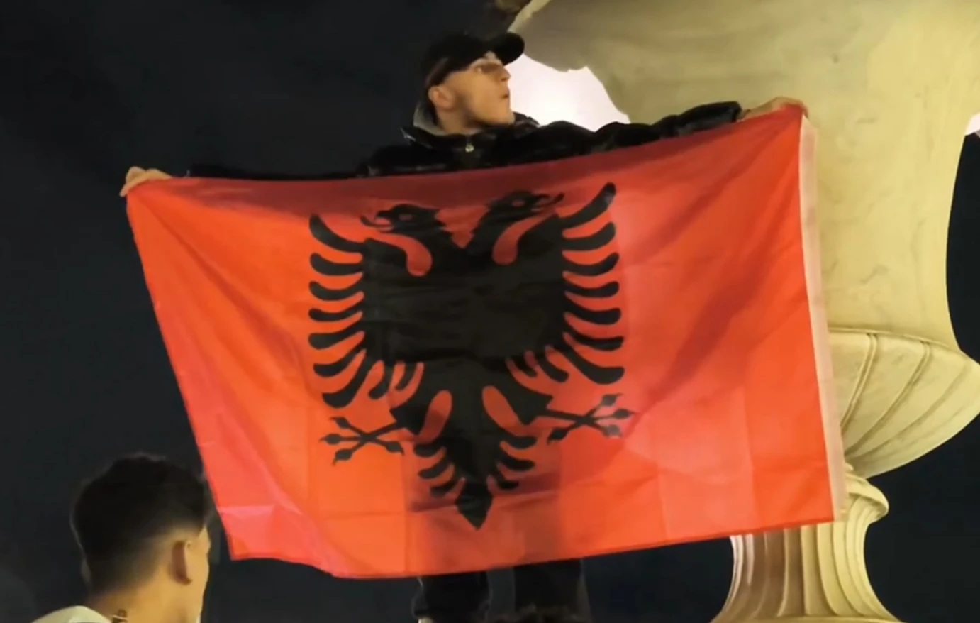 Πολλά από τα αυτοκίνητα που κινούνταν γύρω από την πλατεία ήταν στολισμένα με μεγάλες αλβανικές σημαίες, τις οποίες οι επιβάτες κρατούσαν έξω από τα παράθυρα και τις οροφές. Οι κόρνες ηχούσαν ρυθμικά, ενισχύοντας την αίσθηση γιορτής και ενότητας.