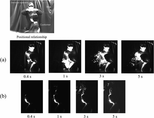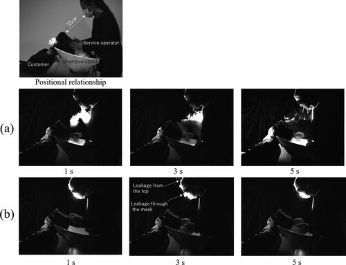 Για να μελετήσει την επίδραση της ομιλίας κατά την εκπνοή, η λέξη «onegaishimasu», ένας τυπικός ιαπωνικός χαιρετισμός σε επιχειρηματικό περιβάλλον, εκφωνήθηκε επανειλημμένα κατά τη μαγνητοσκόπηση. Τα πειράματα πραγματοποιήθηκαν σε κομμωτήριο στο Yamano College of Aesthetics στο Τόκιο. Οι στάσεις σώματος που επιλέχθηκαν για την προσομοίωση, ήταν οι τυπικές σε καταστάσεις κομμωτηρίων και ιατρείων. Ένα παράδειγμα ήταν “πελάτης” που έκατσε για λούσιμο σε κομμωτήριο.