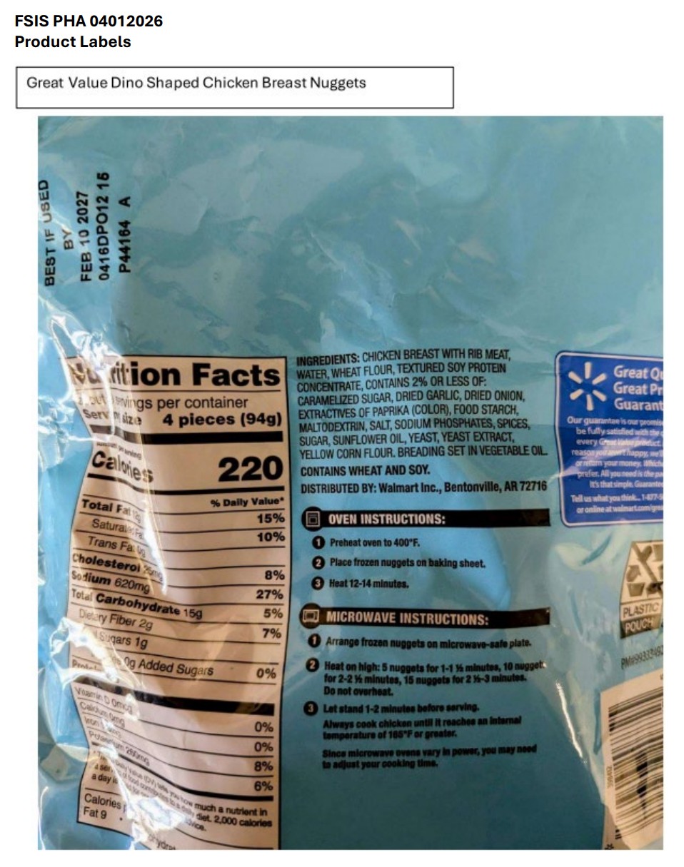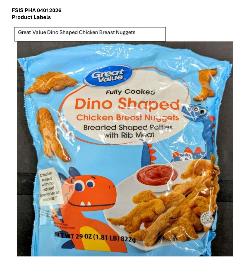 Το προϊόν αφορά συσκευασία 29 ουγγιών με περίπου 36 τεμάχια “GREAT VALUE FULLY COOKED DINO SHAPED CHICKEN BREAST NUGGETS”, με ημερομηνία ανάλωσης έως 10 Φεβρουαρίου 2027, κωδικό παρτίδας 0416DPO1215 και αριθμό εγκατάστασης P44164. Η διάθεση έγινε μέσω της αλυσίδας Walmart.