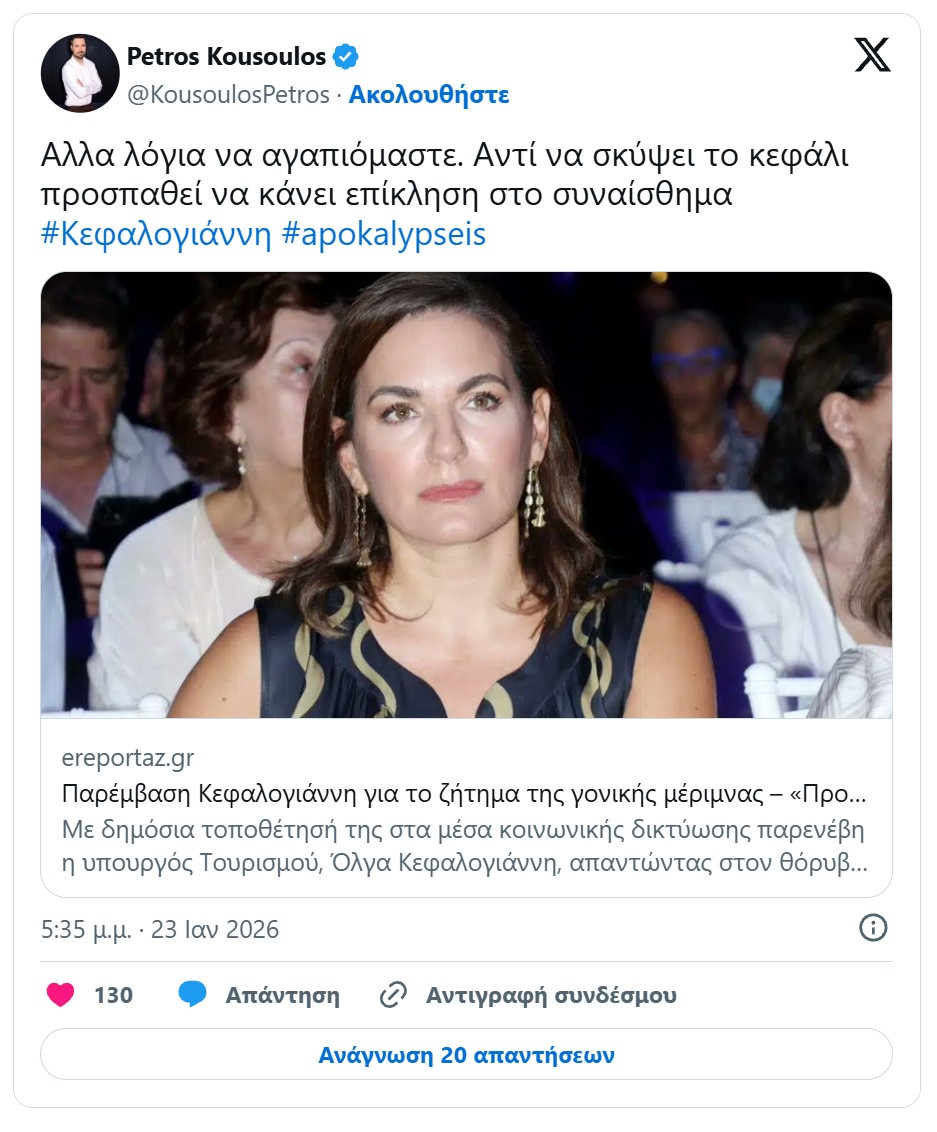 Κατά τη διάρκεια της εκπομπής «Αποκαλύψεις», το μεσημέρι της Παρασκευής (23 Ιανουαρίου), ο Πέτρος Κουσουλός ξέσπασε εναντίον της υπουργού Τουρισμού Όλγας Κεφαλογιάννη, ασκώντας δριμεία κριτική για τον τρόπο που προχώρησε η τροπολογία για τη συνεπιμέλεια των τέκνων. Ο δημοσιογράφος έδειξε ξεκάθαρα την ενόχλησή του με το όλο ζήτημα, δηλώνοντας με έντονο ύφος: