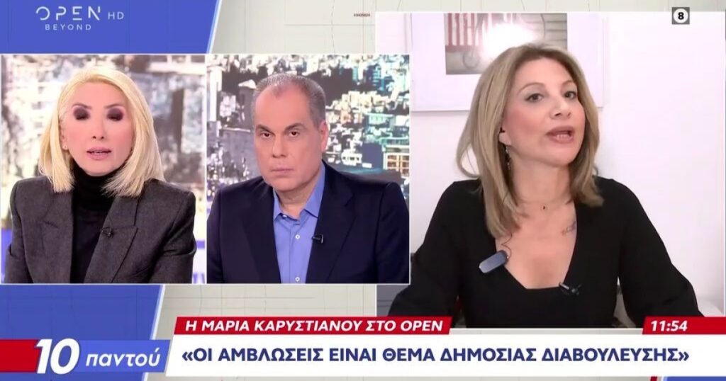 Η Μαρία Καρυστιανού μίλησε στην τηλεόραση του OPEN για την πολιτική, τις αμβλώσεις και τη θέση της απέναντι στο ισχύον σύστημα, εξηγώντας γιατί απορρίπτει τις ιδεολογικές ταμπέλες και επιλέγει μια διαφορετική προσέγγιση σε κοινωνικά και ηθικά ζητήματα.