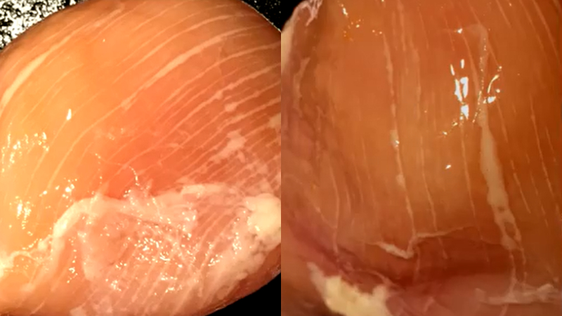 Όσο πιο μεγάλες και ορατές είναι, τόσο χειρότερη είναι η ποιότητα του κοτόπουλου, καθώς το ποσοστό πρωτεΐνης μειώνεται σημαντικά.