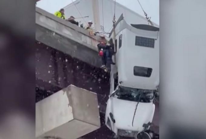 Νταλίκα κρεμόταν στο κενό από γέφυρα – Η απίστευτη διάσωση του οδηγού έπειτα από 5,5 ώρες (video)