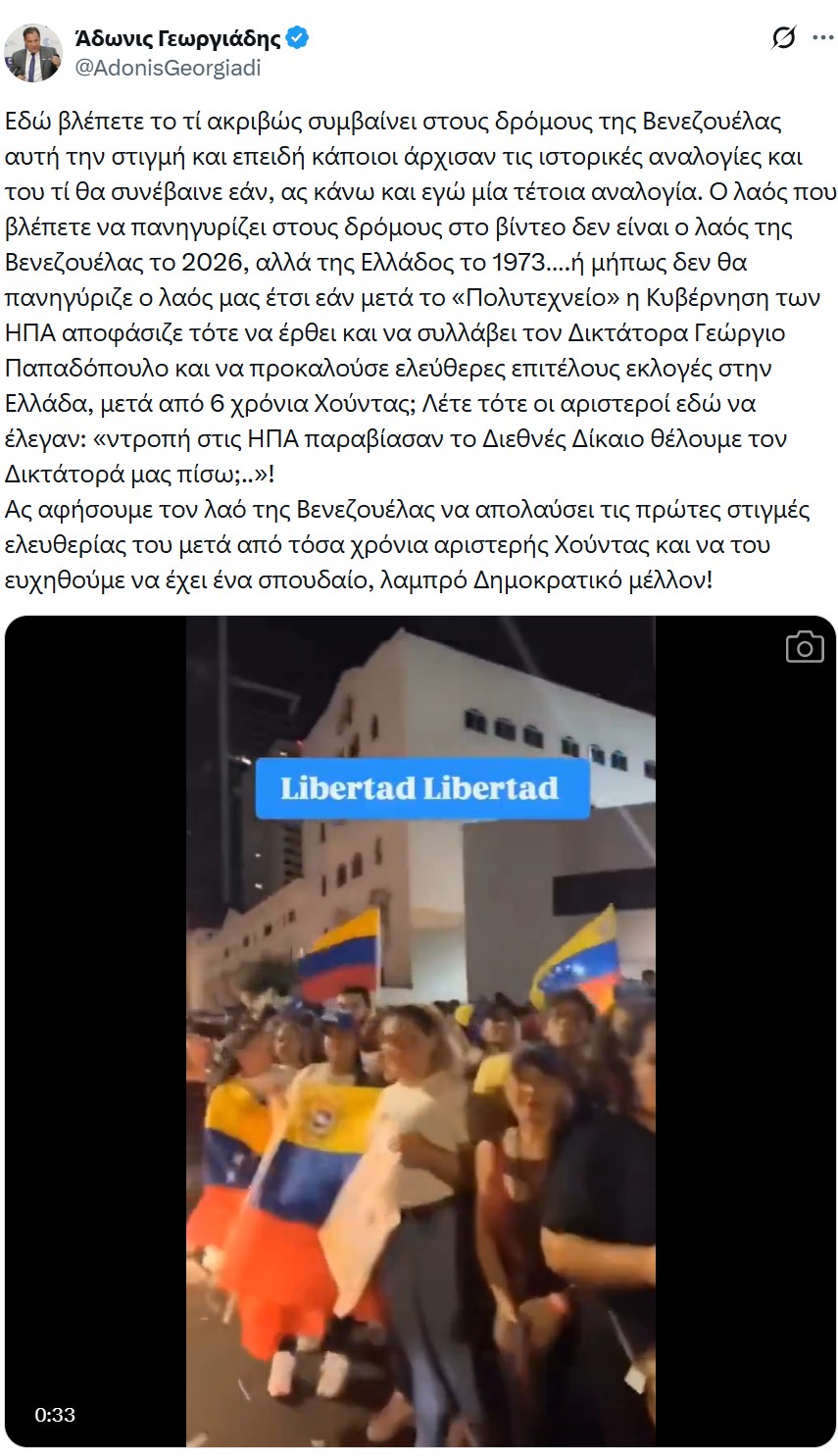 «Εδώ βλέπετε το τι ακριβώς συμβαίνει στους δρόμους της Βενεζουέλας αυτή την στιγμή» έγραψε ο Άδωνις Γεωργιάδης σε ανάρτησή του, σχολιάζοντας τις δήθεν αντιδράσεις των πολιτών μετά τη «σύλληψη» του Νικολάς Μαδούρο. Στην ίδια ανάρτηση συνέχισε: