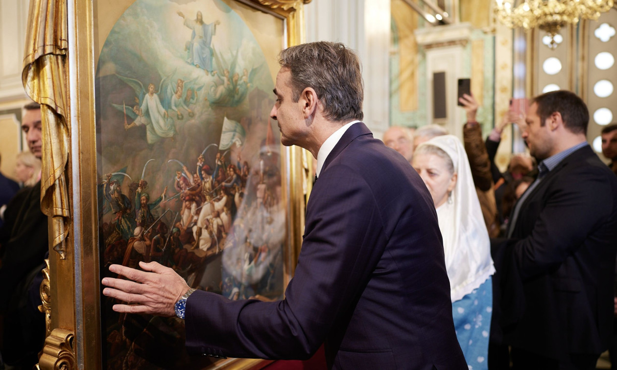 Οι επίσημοι είχαν πάρει τις θέσεις τους, οι κάμερες είχαν εστιάσει σωστά, και το πλήθος περίμενε την κορύφωση της τελετής. Και τότε ο πρωθυπουργός Κυριάκος Μητσοτάκης που παραβρέθηκε στον ιστορικό εορτασμό πλησίασε τον πίνακα αργά, σχεδόν τελετουργικά. Η ημέρα και η στιγμή ήταν εθνικά φορτισμένη. Ο πρωθυπουργός έσκυψε και φίλησε την εικόνα με θρησκευτική ευλάβεια σαν να ήταν το εικόνισμα κάποιου Αγίου ή σαν να το πέρασε για τέτοιο.