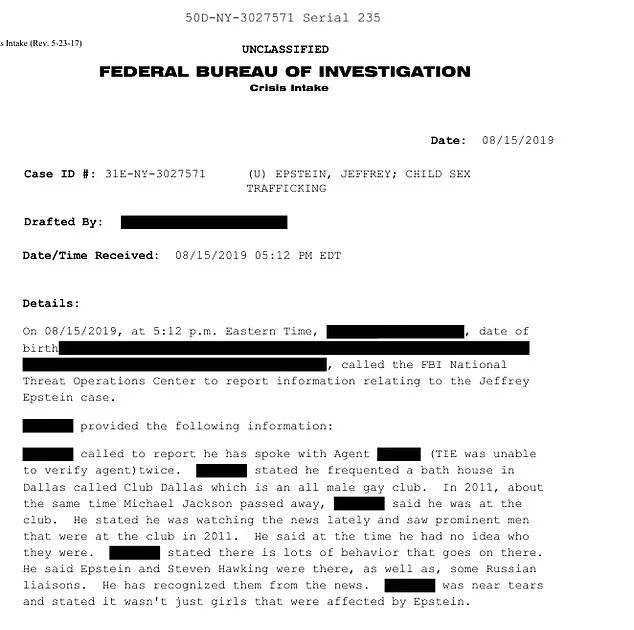 Κάποιος επικοινώνησε με το FBI και ισχυρίστηκε ότι ο Επστάιν επισκέφθηκε ένα «κλαμπ αποκλειστικά για ομοφυλόφιλους άνδρες» με τον Χόκινγκ το 2011