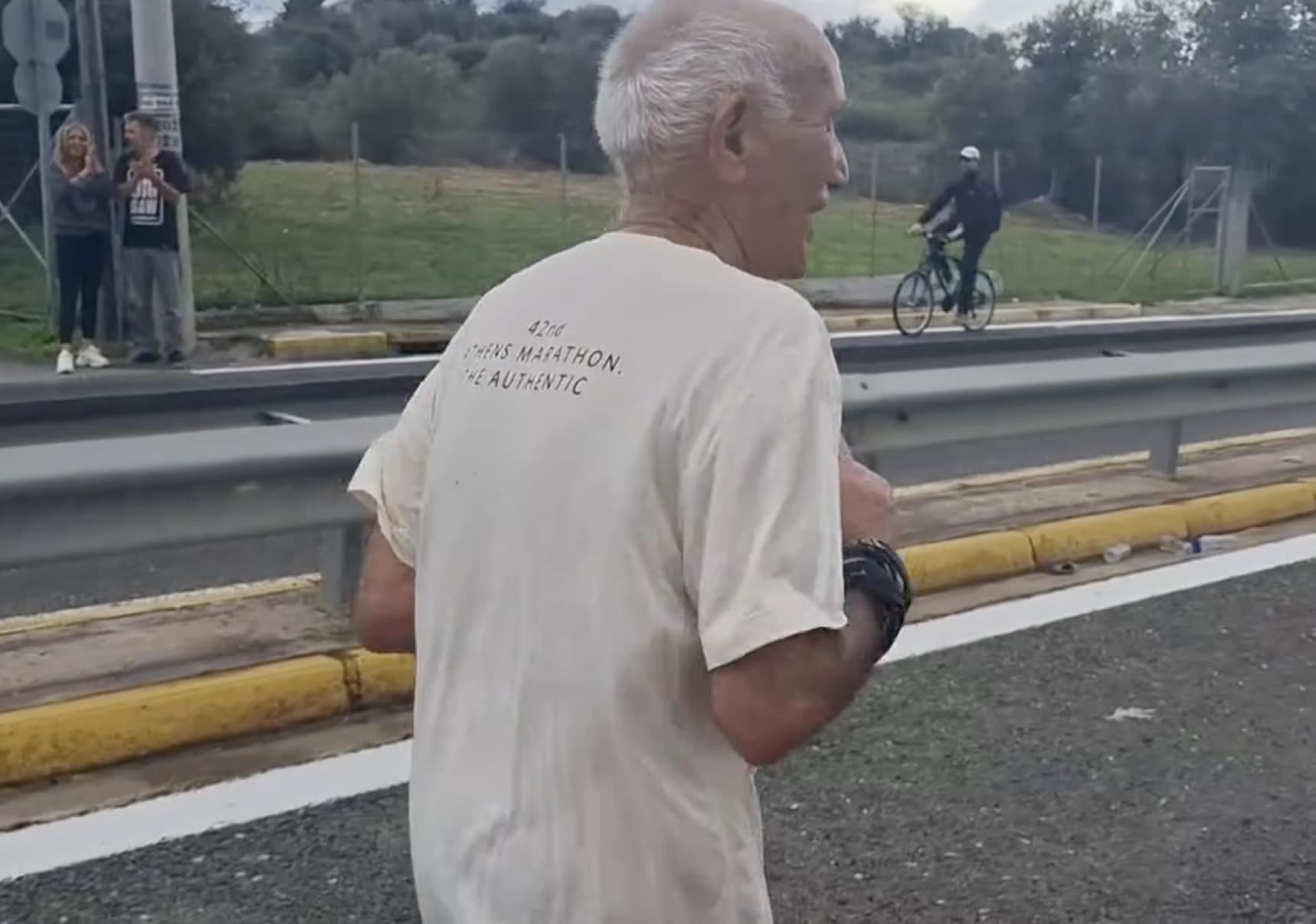 Όπως καταγράφεται σε βίντεο που ανέβηκε στο Facebook και αναπαράγει το gazzetta.gr, ο κύριος Πλούταρχος τρέχει χαμογελαστός, με ήρεμο ρυθμό και καθαρό βλέμμα. Δεν δείχνει ίχνος κόπωσης ούτε έπαρσης. Οι θεατές τον χειροκροτούν καθώς διασχίζει τη διαδρομή των 42 χιλιομέτρων με αφοπλιστική φυσικότητα, δίνοντας την εντύπωση ότι για εκείνον είναι μια απλή βόλτα.