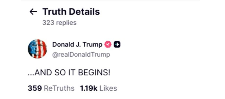 Λίγο μετά την ανακοίνωση των αποτελεσμάτων, ο Τραμπ επανήλθε με ένα μυστηριώδες μήνυμα: «…Και έτσι αρχίζει!» έγραψε, τη στιγμή που ο Μαμντάνι απευθυνόταν άμεσα στον ίδιο στην ομιλία της νίκης του.