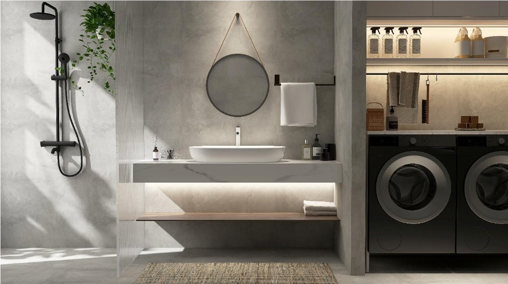 Η συνεχόμενη επιφάνεια δημιουργεί αίσθηση ενιαίου χώρου, κάνοντας ακόμη και μικρά μπάνια να δείχνουν πιο ευρύχωρα. Η δυνατότητα να εφαρμοστεί στο ίδιο ύφος σε δάπεδο, τοίχους και χτιστές κατασκευές προσδίδει αποτέλεσμα υψηλής αισθητικής χωρίς υπερβολές.