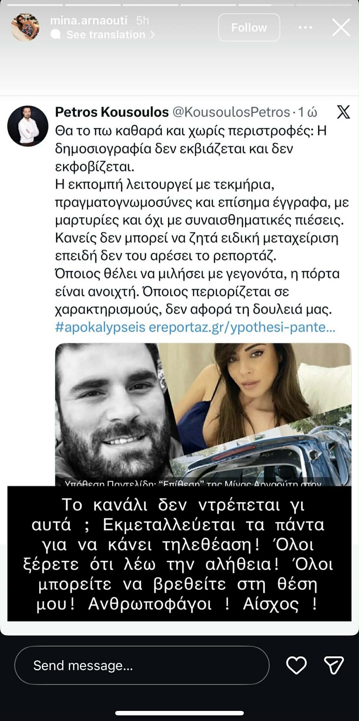 Από την πλευρά του, ο Πέτρος Κουσουλός παραμένει σταθερός στα ρεπορτάζ του και απαντά στις επιθέσεις δηλώνοντας: