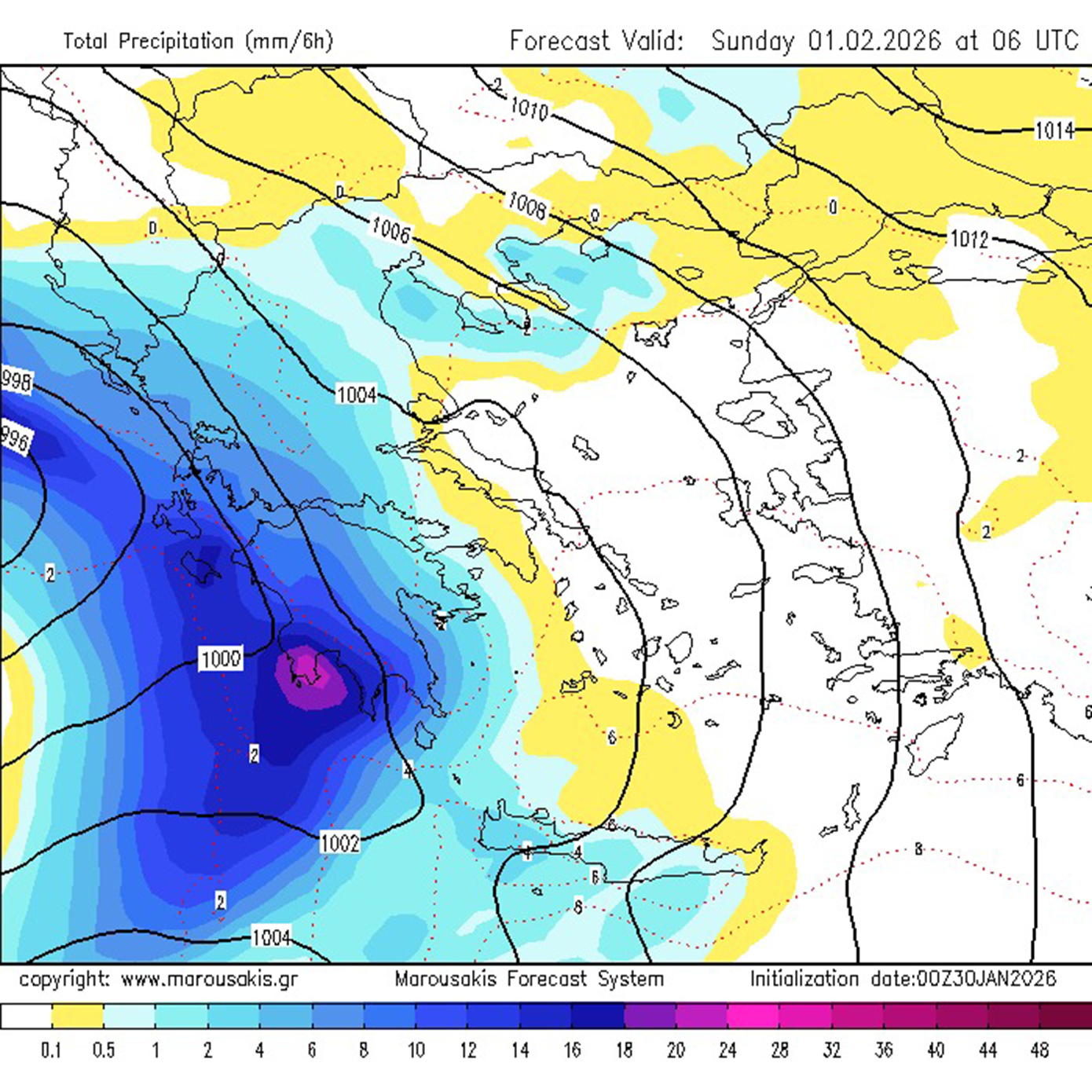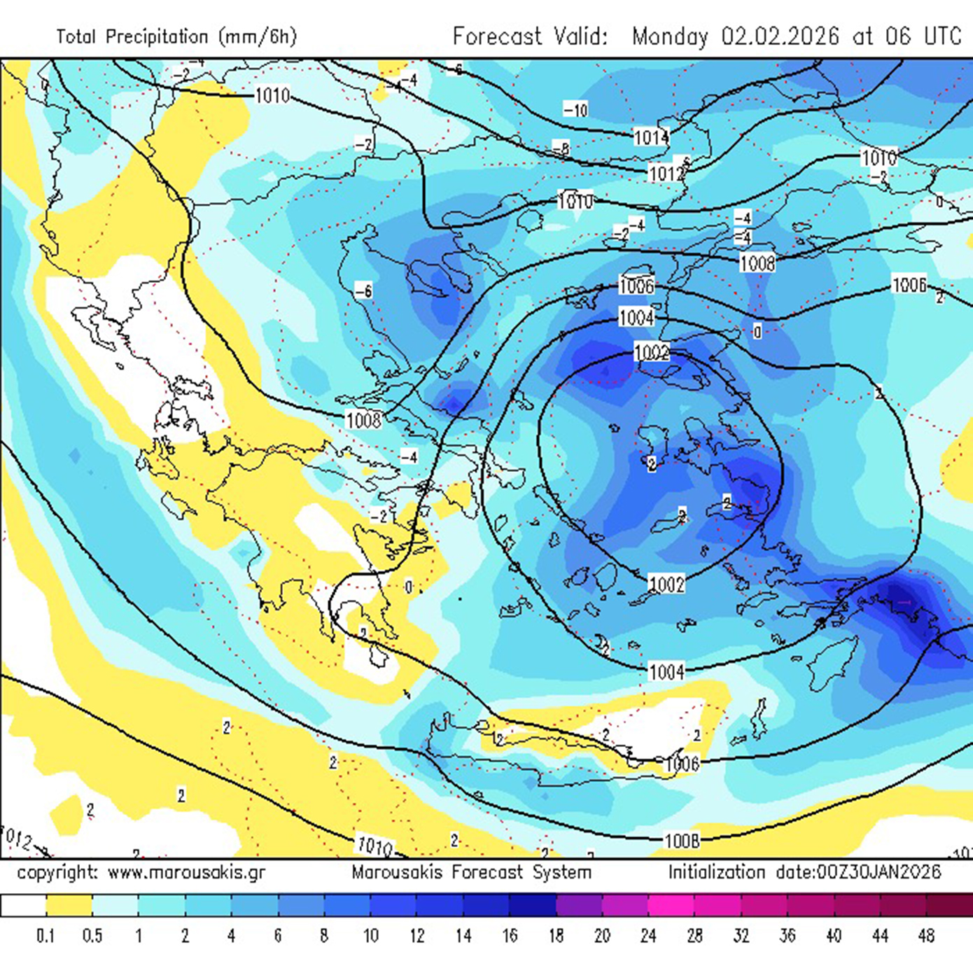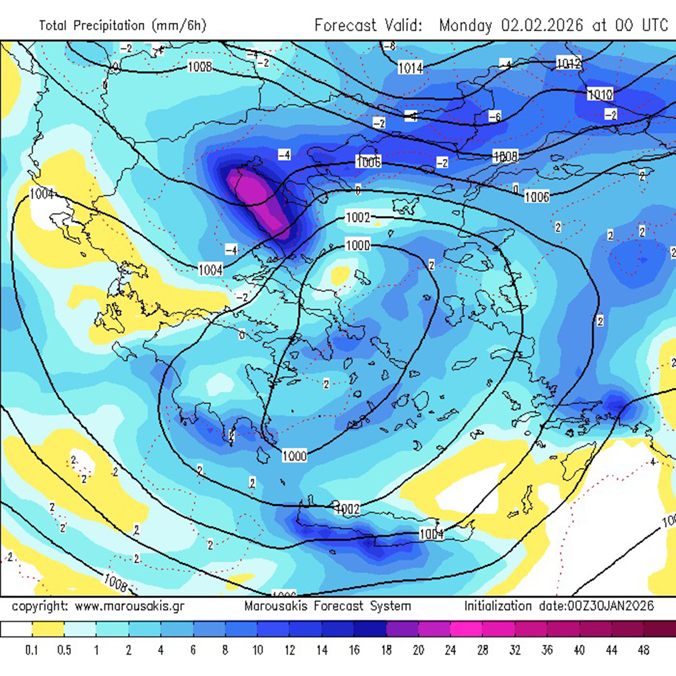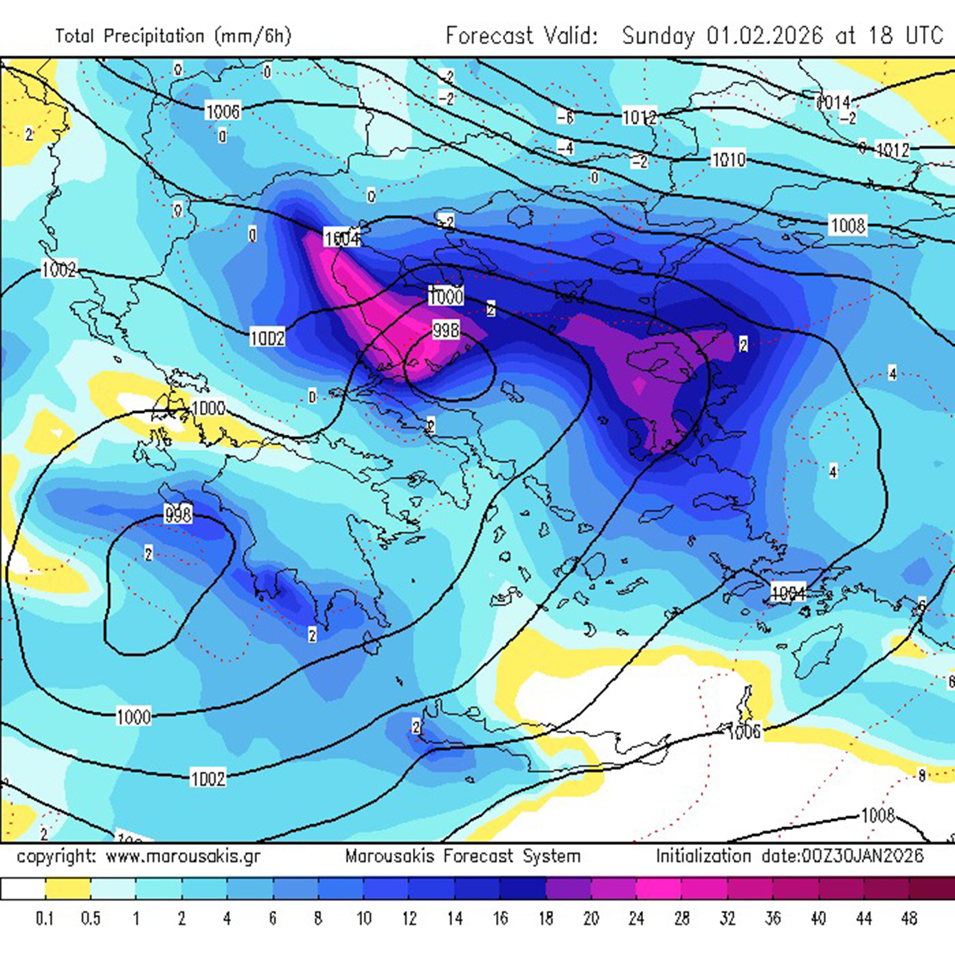 ✅Ένα βαθύ βαρομετικό χαμηλό θα μας επηρεάσει από το απόγευμα του Σαββάτου και κυρίως την Κυριακή μέχρι το μεσημέρι της Δευτέρας με ισχυρές βροχές και καταιγίδες. Το σύστημα παρουσιάζει σαφή σπειροειδή δομή, ισχυρή σύγκλιση χαμηλών στρωμάτων, μεγάλα… pic.twitter.com/8FjVy2j74V— Theodoros Kolydas (@KolydasT) January 30, 2026