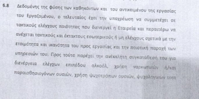 Στο πλαίσιο αυτό, ο μισθωτός «έχει την υποχρέωση να συμμετέχει σε τακτικούς ελέγχους ποιότητας, που διενεργεί η Εταιρεία και περαιτέρω να ανέχεται τακτικούς και έκτακτους εσωτερικούς ή μη ελέγχους σχετικά με την ετοιμότητα και ικανότητά του προς εργασία και την ποιοτική παροχή των υπηρεσιών του». Αυτό είναι το πλαίσιο εντός του οποίου ο μισθωτός υποχρεούται να παρέχει την ανέκκλητη συγκατάθεσή του για τους βιομετρικούς ελέγχους, διαφορετικά υποχρεούται να προσκομίζει στην εταιρεία οποτεδήποτε του ζητηθεί σχετικές ιατρικές εξετάσεις, από τις οποίες θα «δύναται να διαπιστωθεί η ικανότητά του προς εργασία».