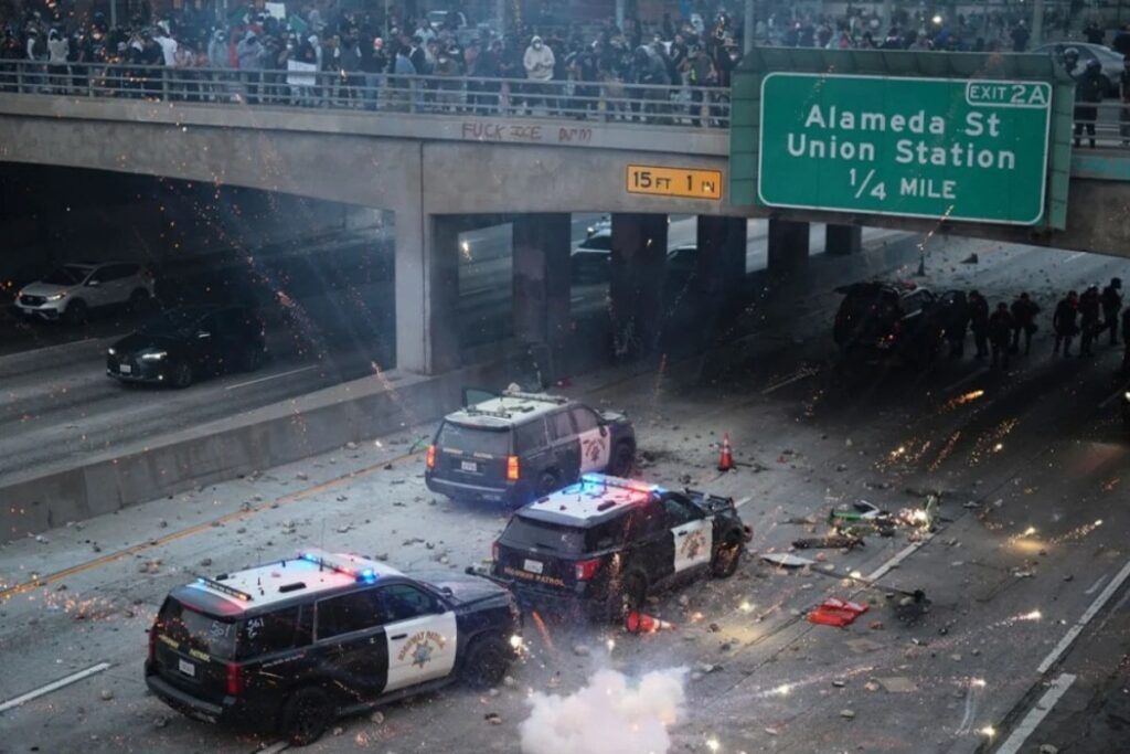BREAKING: Los Angeles sees escalating unrest. Demonstrators have damaged police cruisers on U.S. Route 101 by hurling objects from an overpass, while barricades are now erected outside City Hall. pic.twitter.com/6a7hTDcwIJ