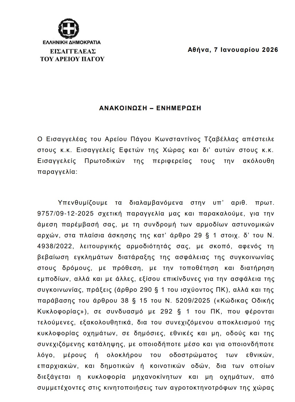 Ο εισαγγελέας του Αρείου Πάγου, Κωνσταντίνος Τζαβέλλας, απέστειλε κατεπείγουσα οδηγία σε όλους τους εισαγγελείς Εφετών και Πρωτοδικών της χώρας, ζητώντας άμεσες ενέργειες για να σταματήσουν οι αποκλεισμοί στο εθνικό και επαρχιακό οδικό δίκτυο. Πρόκειται για τη δεύτερη φορά που επανέρχεται στο ίδιο ζήτημα, υπενθυμίζοντας την προηγούμενη παραγγελία του και απαιτώντας την άμεση εφαρμογή της χωρίς καμία καθυστέρηση.
