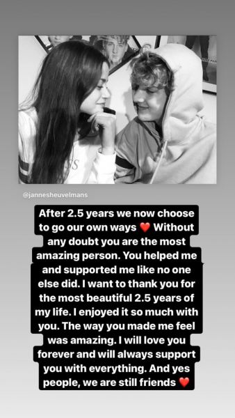 « Μετά από 2,5 όμορφα χρόνια, η Stef και εγώ καταλήξαμε στο συμπέρασμα ότι πρέπει να ακολουθήσουμε ο καθένας τον δρόμο του. Είμαι πολύ ευγνώμων για τις υπέροχες στιγμές που μπορέσαμε να ζήσουμε μαζί με τη Stef. Κοιτάζω πίσω σε αυτά τα όμορφα χρόνια με μεγάλη ευτυχία. Ευτυχώς, δεν συνέβη τίποτα κακό, που μας οδήγησε να κάνουμε αυτήν την επιλογή. Το επιλέξαμε μαζί και είναι το καλύτερο και για τους δύο. Εύχομαι στη Stef καλή επιτυχία σε όλα τα υπέροχα πράγματα που κάνει και θα συνεχίσω να την υποστηρίζω για πάντα».