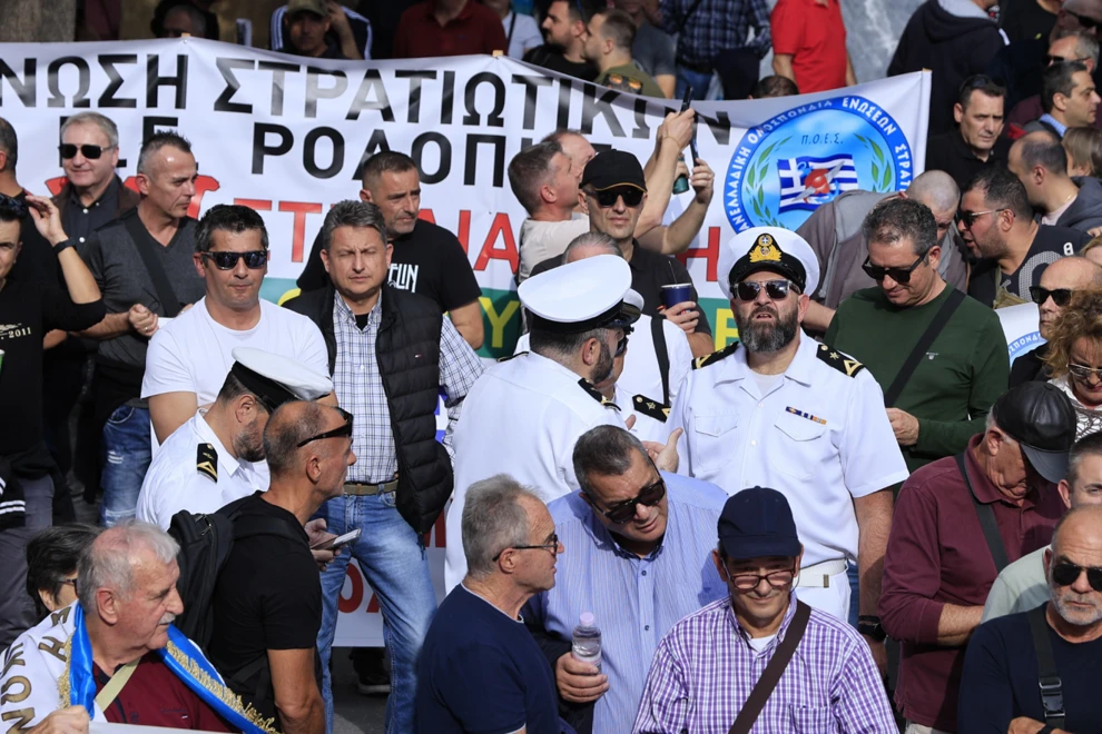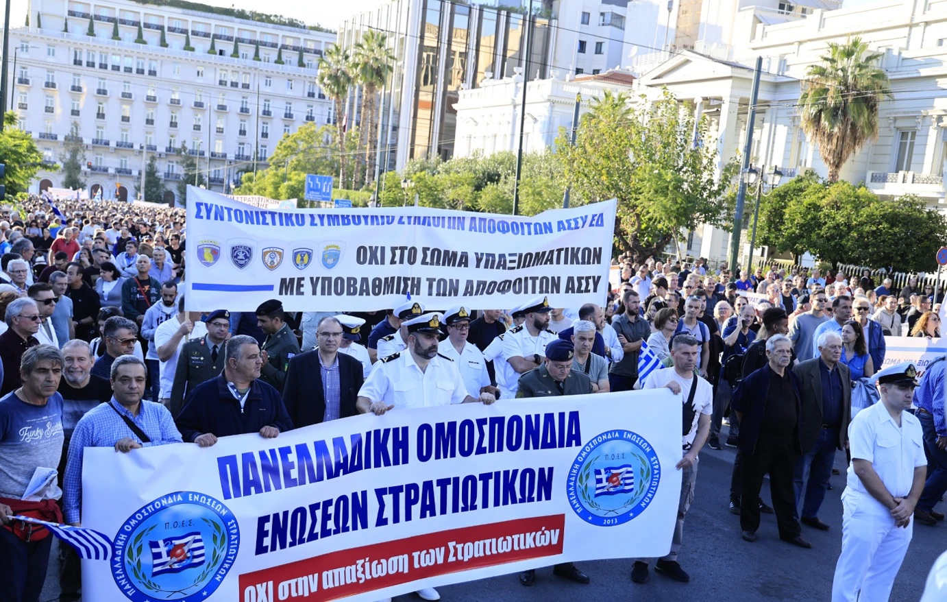 Στο κέντρο της Αθήνας συγκεντρώθηκαν μαζικά εν ενεργεία και απόστρατοι στρατιωτικοί, διαμαρτυρόμενοι έντονα για τις αλλαγές που προωθούνται στο βαθμολόγιο και τις επιπτώσεις στις καριέρες τους.